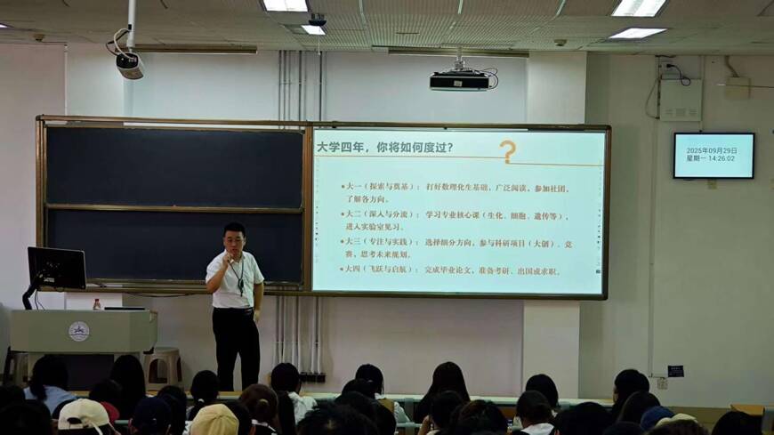 随后,杨院长将分享重点转向大学生活规划,围绕如何度过有价值的四年展开针对性指导。他不仅提炼出三个兼具实用性与指导性的“成长锦囊”,更结合生物学学科特点提出具体期望与要求。既帮助大家清晰锚定大学阶段的发展方向,也让同学们在探索生物学的道路上,更添脚踏实地的底气与勇往无前的动力。