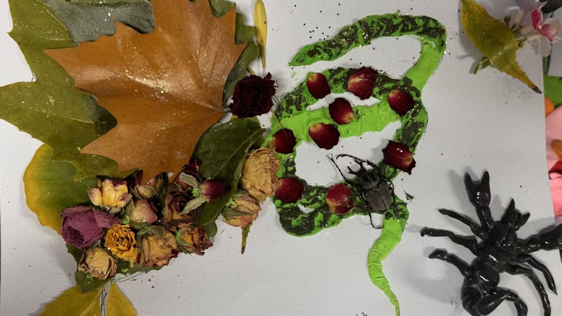 活动伊始,部长们讲解内容并提供彩泥、干花、昆虫标本等材料;随后成员分组创作,用粘土捏制瓢虫、蜻蜓、蝎子等昆虫,拼接植物叶子,融合两者元素呈现创意佳作。最终完成十余组作品,部分因创意新颖获好评。