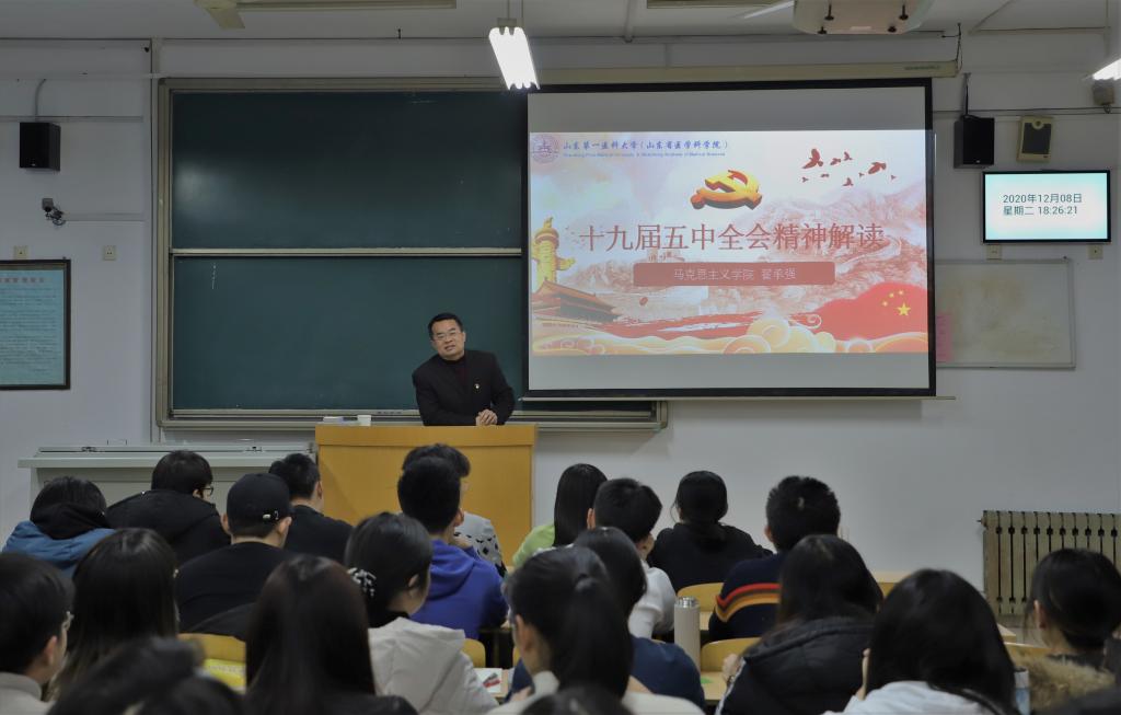 翟承强同志对党的十九届五中全会精神为同学们从三个方面进行了解读,介绍了全会召开的背景、主要成果、起草情况、突出特点、逻辑主线、《建议》和《公报》的内容要点、核心要义等;具体讲解了全会十个新提法;通过精彩的图片展示了党的十九届五中全会的核心内容。宣讲穿插具体实例,从民生出发,生动形象,为大学生展示了我们党取得的伟大成就和宏伟蓝图。
