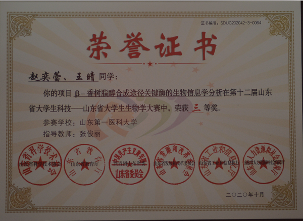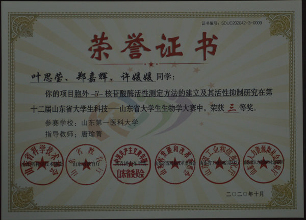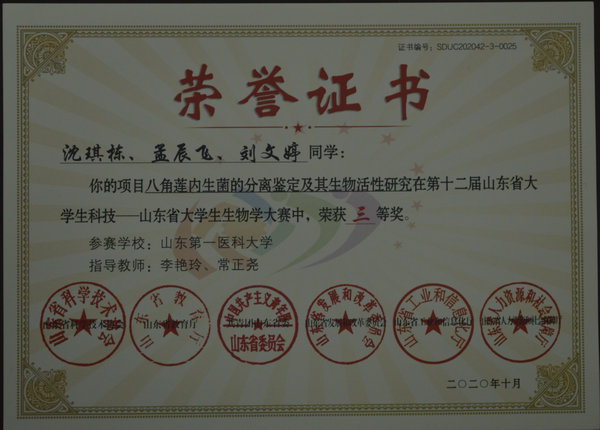近日,第十二届山东省大学生科技节赛事活动——山东省大学生生物学大赛通过线上线下相结合的方式举行。此次比赛从2019年9月开始报名,经立项、实验、论文撰写等,再经初赛、网评、线上线下决赛评审,经历一年多时间,我院的参赛选手获得山东省大学生生物学大赛一等奖1项,三等奖5项。