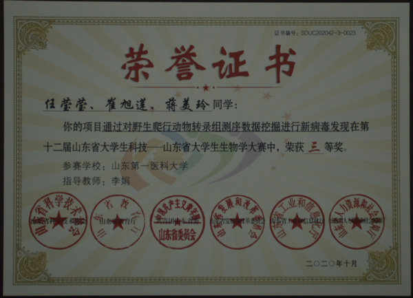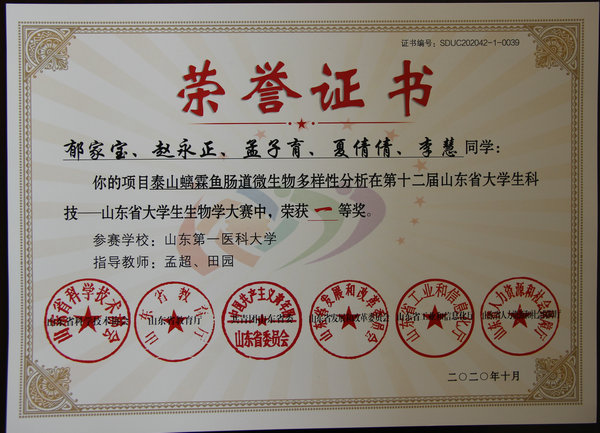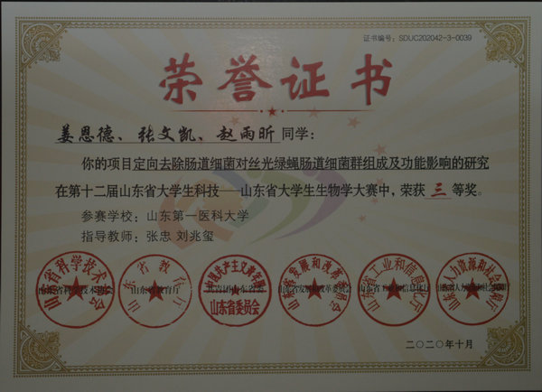 经由专家对参赛项目、实验结果和答辩视频的评审,郁家宝、赵永正等同学的项目《泰山螭霖鱼肠道微生物多样性分析》(孟超、田园指导)获得大赛一等奖。姜恩德、张文凯、赵雨昕同学的项目《定向去除肠道细菌对丝光绿蝇肠道细菌群组成及功能影响的研究》(张忠、刘兆玺指导),沈琪栋、刘文婷、孟辰飞同学的项目《八角莲内生菌的分离鉴定及其生物活性研究》(李艳玲、常正尧指导),叶思莹、郑嘉辉、许媛媛同学的项目《胞外-5'-核苷酸酶活性测定方法的建立及其活性抑制研究》(唐瑜菁指导),任莹莹、崔旭莲、蒋美玲同学的项目《通过对野生爬行动物转录组测序数据挖掘进行新病毒发现》(李娟指导),以及赵奕蕾、王晴同学的项目《β-香树脂醇合成途径关键酶的生物信息学分析》(张俊丽指导)获得大赛三等奖。多名老师荣获优秀指导教师。