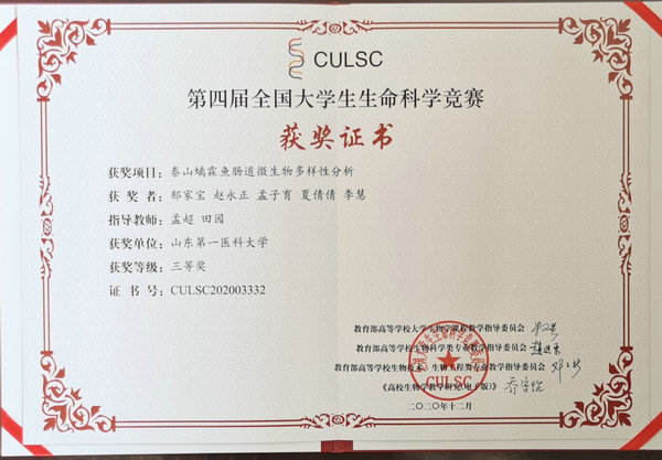 本次比赛从去年9月份开始报名,历经12个多月,通过实验设计、实验研究、实验记录、论文撰写、线上答辩等多个环节,经初赛、网评、山东省省赛等层层选拔,由孟超、田园老师指导,郁家宝、赵永正、孟子育、夏倩倩、李慧同学参赛作品《泰山螭霖鱼肠道微生物多样性分析》荣获全国三等奖。