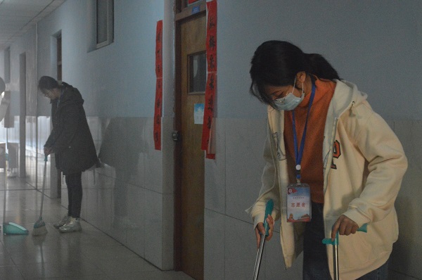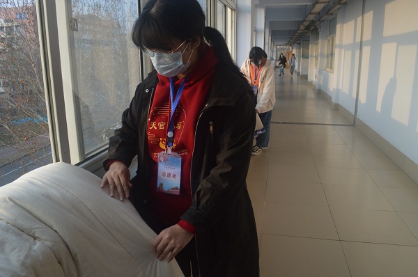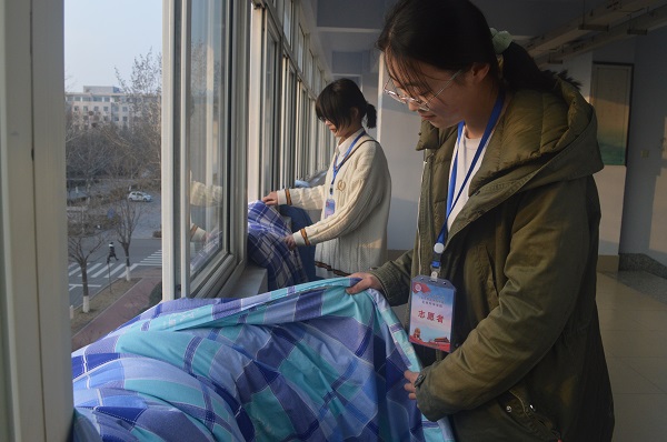 活动当天正值学生返校之日,一部分服务团成员来到校门口,他们热情服务,耐心引导,在校门口提前审核返校学生本人的健康码、询问是否有符合返校要求的返校凭证,并督促返校学生进校扫描注册“金钟罩”小程序,以保护财产安全;同时,在同学们到达校门的那一刻,志愿者就会及时地迎上去帮助同学们搬运行李,一路帮助搬运至宿舍,大大减轻了返校同学的负担,也让一同来送行的家长放心。另一部分成员来到学生宿舍,为了让学生回到学院后有一个温馨舒适的环境,志愿者纷纷帮助返校晚的同学晾晒被褥。他们深入宿舍,将需要晾晒的被褥做好标签,确保被子晾晒后准确放回原处。同时,他们主动打扫宿舍公共区域卫生,为同学们营造干净整洁的住宿环境。志愿者们忙碌的背影成为了校园内一道靓丽的风景线。